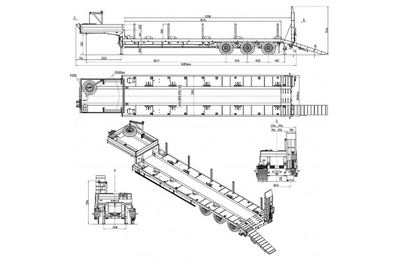 47000 кг, шины 395/85R20 или 445/65R22,5 / 6+1, платформа 11502 по трапам) x 2500 с уширителями до 3000 мм, треугольные аппарели, ССУ 1530 мм, рессорная подвеска, раздвижные коники 1500 мм