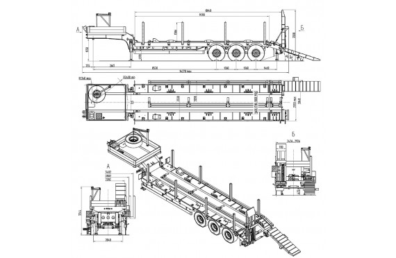 45000 кг, шины 445/65R22,5 или 395/85R20 / 6+1, платформа 10300 (11080 до трапов) x 2500 с уширителями до 3000 мм, механические трапы, ССУ 1510 мм, рессорная подвеска, съемные стойки 1500 мм