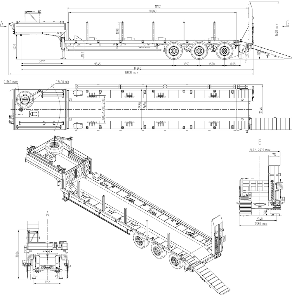 39000 кг, шины 385/65R22,5 или 445/65R22,5 / 6+1, платформа 11080 до трапов) x 2500 с уширителями до 3000 мм, ССУ 1510 мм, пневматическая или рессорная подвеска, съемные стойки 1500 мм, механические трапы