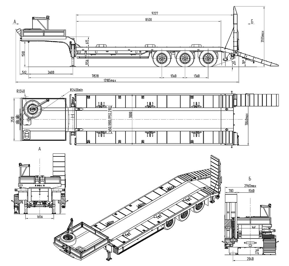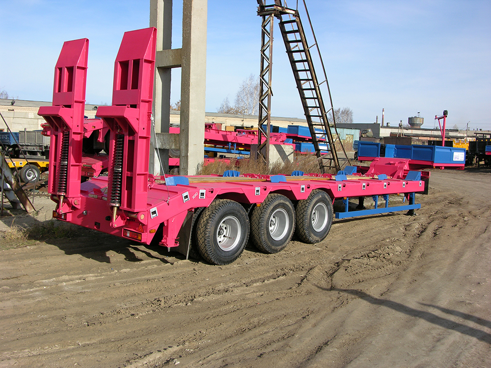 39000 кг, шины 385/65R22,5 или 445/65R22,5 / 6+1, платформа 11080 до трапов) x 2500 с уширителями до 3000 мм, ССУ 1510 мм, рессорная подвеска, съемные стойки 1500 мм, механические трапы